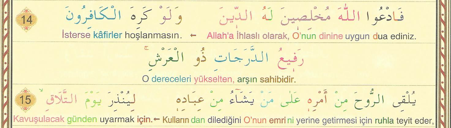# kelime anlam kök 1 zalikum bu 2 biennehu sebebiyledir 3 iza zaman 4 duiye çağrıldığınız دعو 5 llahu Allah’a 6 vehdehu tek olan وحد 7 kefertum inkar etmeniz كفر 8 vein ve eğer 9 yuşrak ortak koşulursa شرك 10 bihi O’na 11 tu’minu inanmanız امن 12 felhukmu artık hüküm حكم 13 lillahi Allah’a aittir 14 l-aliyyi yüce علو 15 l-kebiri ve büyük كبر