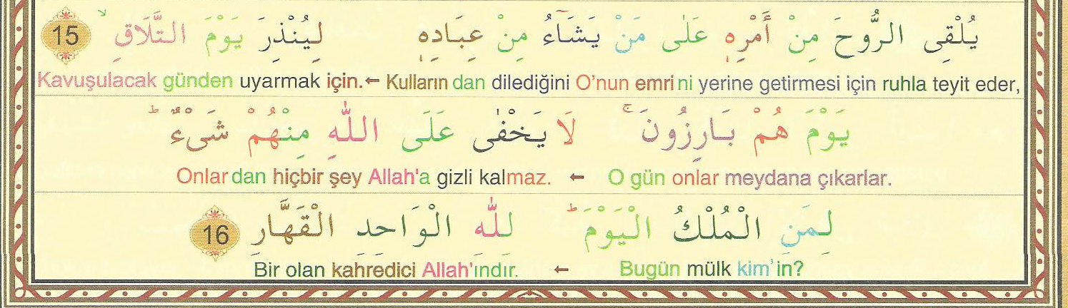 Onların (mezarlarından) meydana fırlayacakları gün, kendilerinin yapmış olduğu hiçbir şey Allah’a gizli kalmaz. “Bugün mülk kimindir?” (buyurulur). “Bir olan, herşeyi kudreti altında tutan Allah’ındır.” (denir).