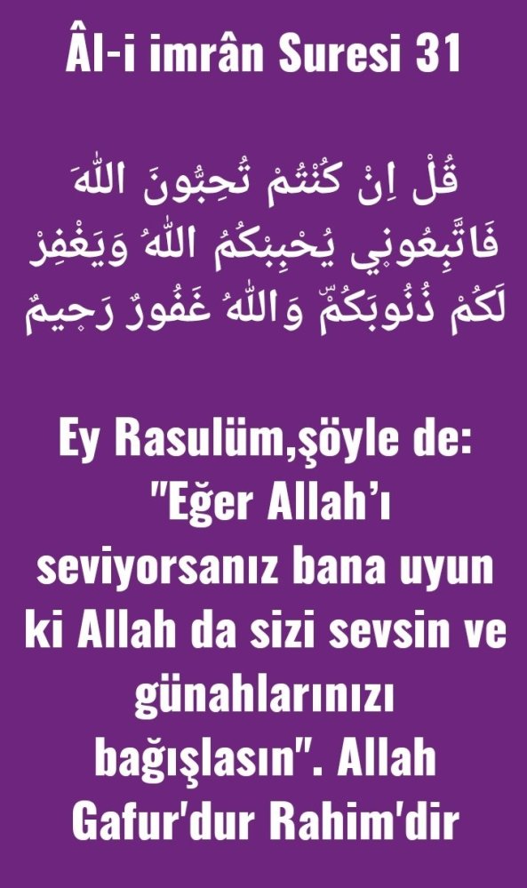 Ey Rasulüm,şöyle de: “Eğer Allah’ı seviyorsanız bana uyun ki Allah da sizi sevsin ve günahlarınızı bağışlasın”. Allah Gafur’dur Rahim’dir