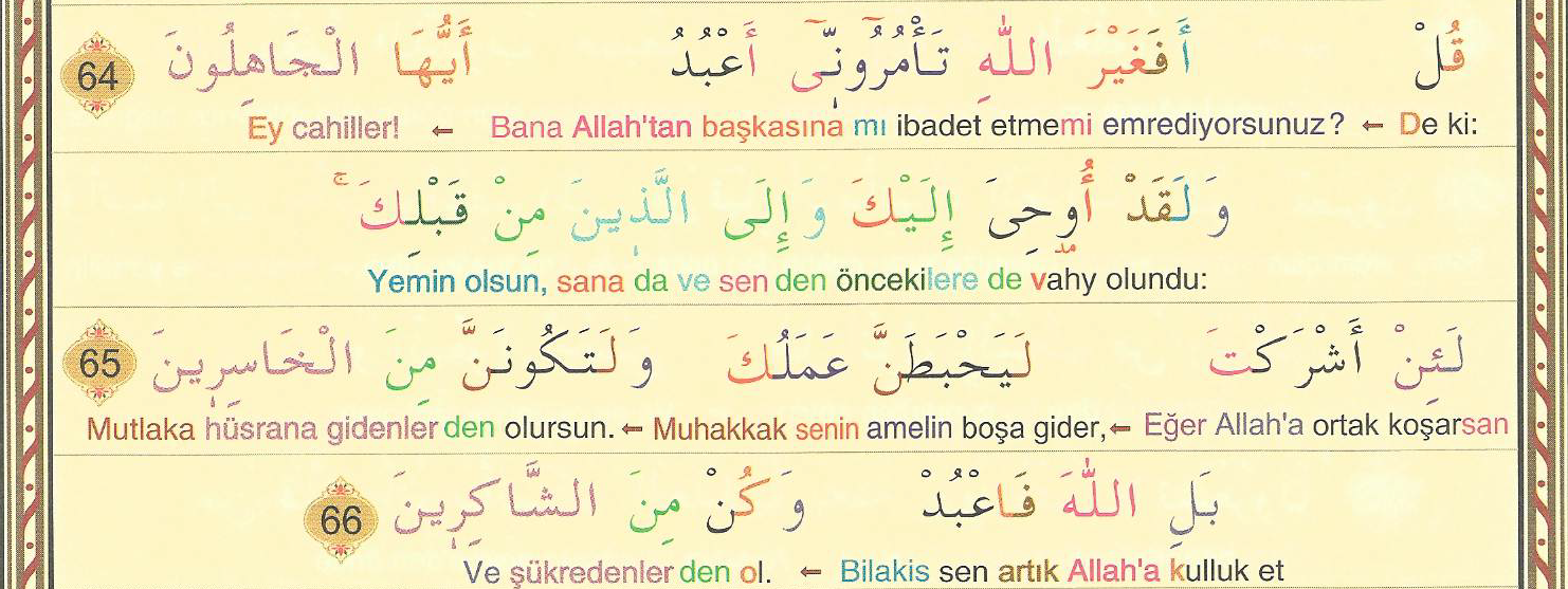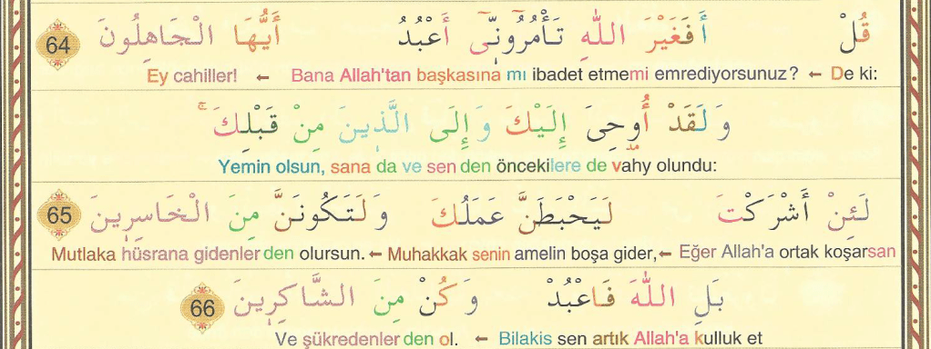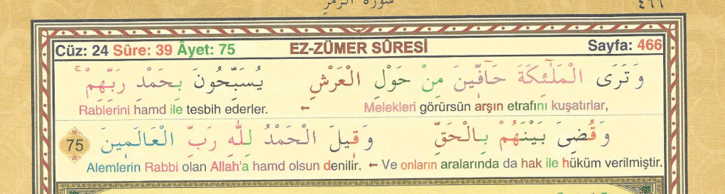 Melekleri de, Rablerini hamd ile tesbih edip yücelterek Arş’ın etrafını kuşatmış halde görürsün. Artık kulların arasında adaletle hüküm verilmiş ve “Hamd alemlerin Rabbi olan Allah’a mahsustur” denilmiştir.