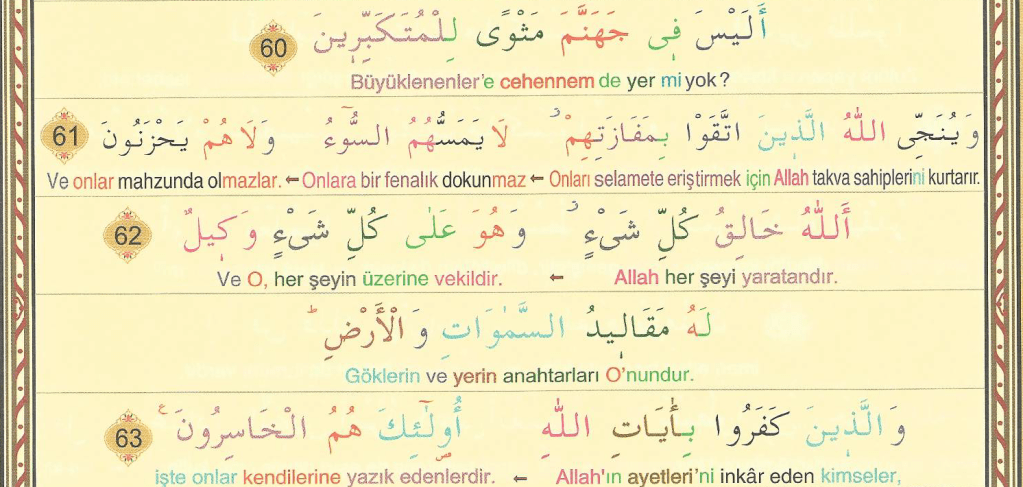 Vesikallezine keferu ila cehenneme zumera, hatta iza cauha futihat ebvabuha, ve kale lehum hazenetuha e lem ye’tikum rusulun minkum yetlune aleykum ayati rabbikum ve yunzirunekum likae yevmikum haza, kalu bela ve lakin hakkat kelimetul azabi alel kafirin.