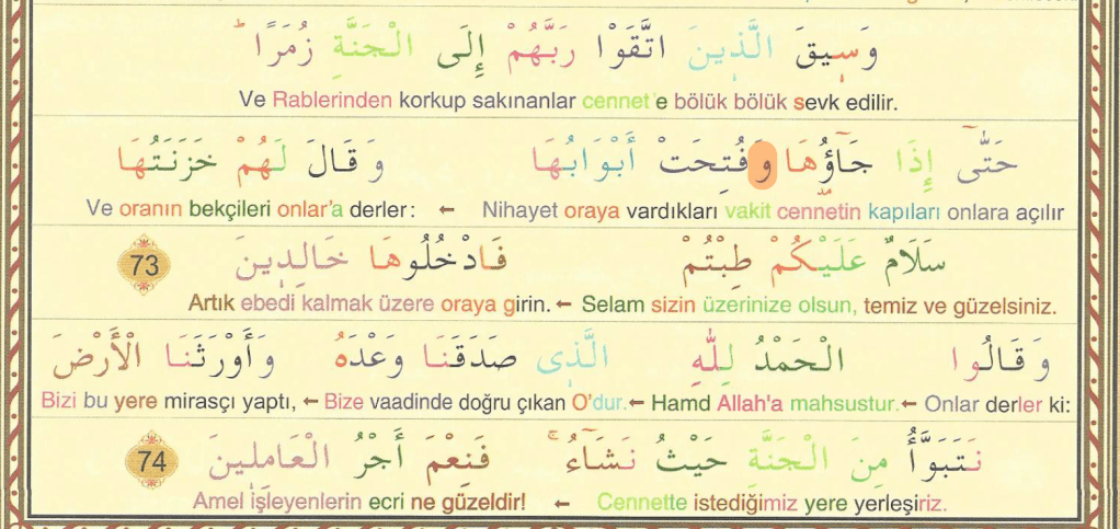 Vesikallezinettekav rabbehum ilel cenneti zumera, hatta iza cauha ve futihat ebvabuha ve kale lehum hazenetuha selamun aleykum tıbtum fedhuluha halidin.