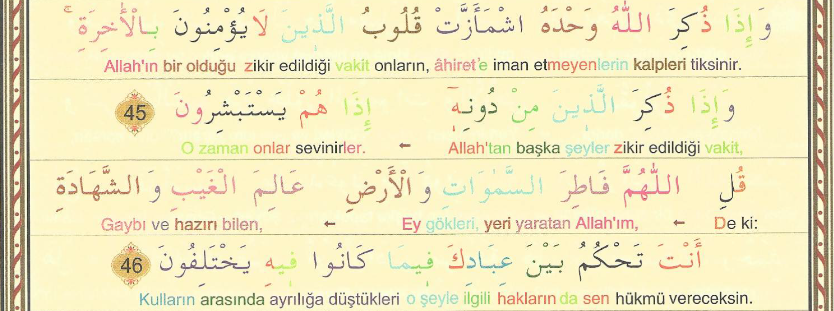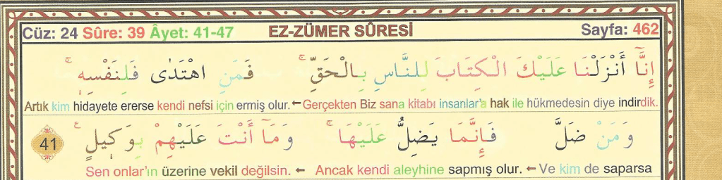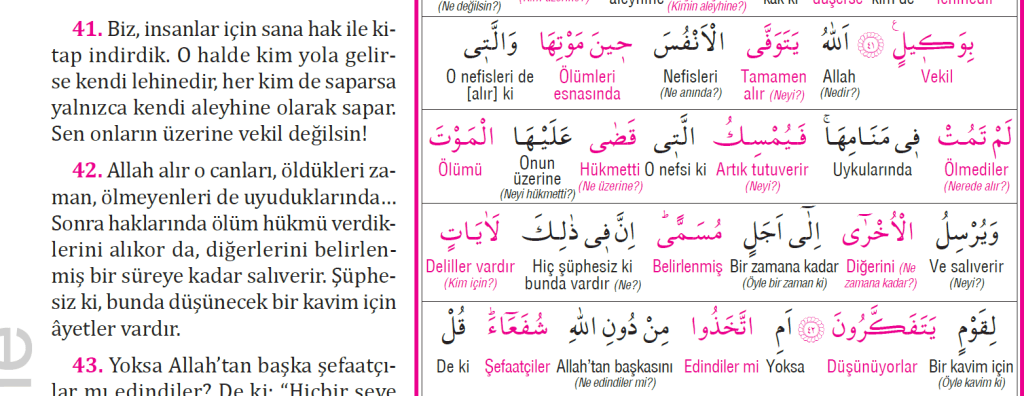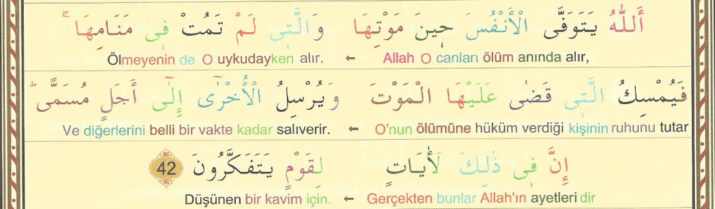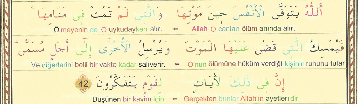 “Allah, ölümü anında nefisleri vefat ettirir; ölmeyenleri de uykularında. Ölümüne hükmettiğini yanında tutar, diğerlerini belirlenmiş bir süreye kadar salıverir. Bunda düşünen bir halk için alınacak pek çok ders vardır.”