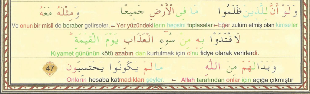 Ve lev enne lillezine zalemu ma fil ardı cemian ve mislehu meahu leftedev bihi min suil azabi yevmel kıyameh, ve beda lehum minallahi ma lem yekunu yahtesibun.