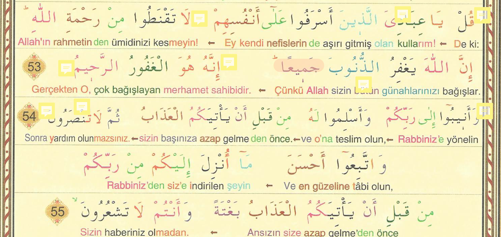 De ki: “Ey kendilerinin aleyhine aşırı giden kullarım! Allah’ın rahmetinden ümidinizi kesmeyin. Şüphesiz Allah, bütün günahları affeder. Çünkü O, çok bağışlayandır, çok merhamet edendir.”