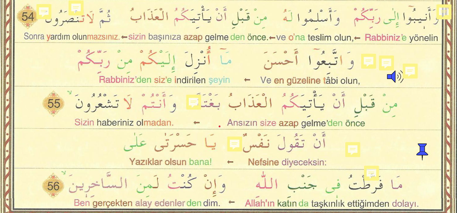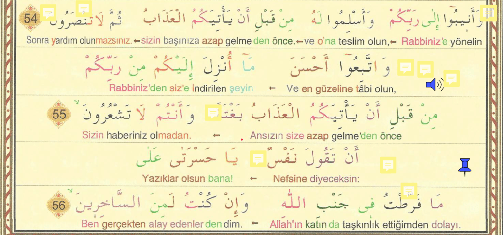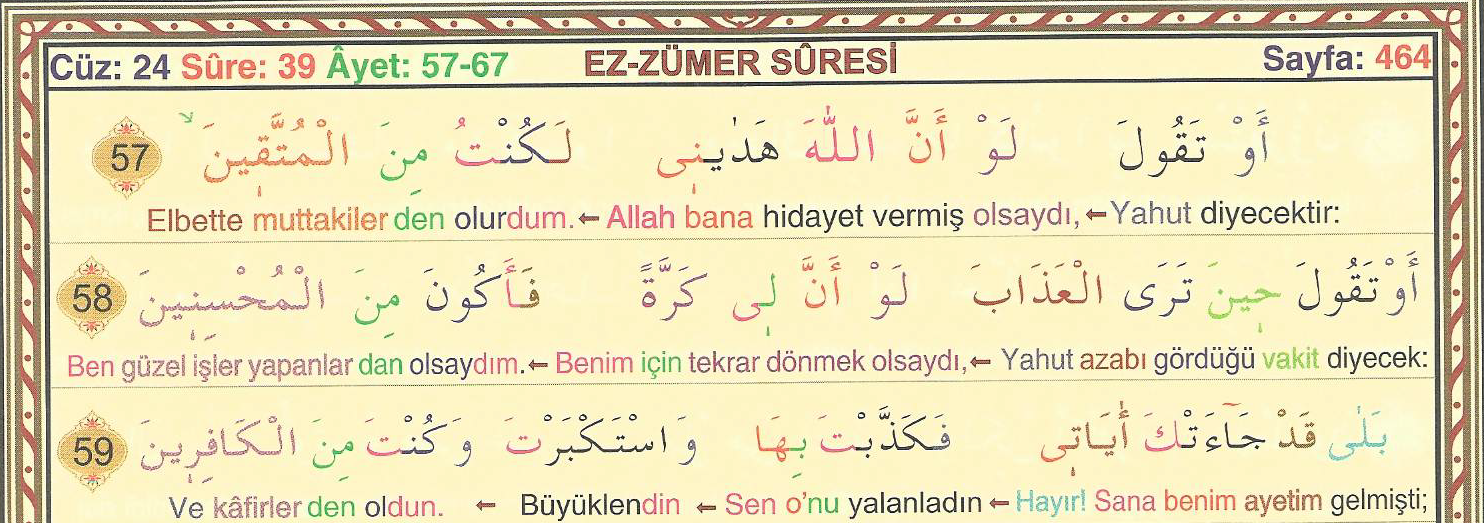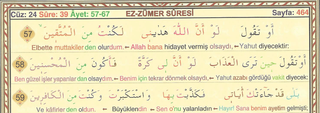 ”Allah’ın yanında, işlediğim aşırılıklardan dolayı vay hâlime! Gerçekten ben alay edenlerden idim” ”Allah beni doğru yola iletseydi, elbette O’na karşı gelmekten sakınanlardan olurdum” ”Keşke benim için dünyaya bir dönüş daha olsa da iyilik yapanlardan olsam”