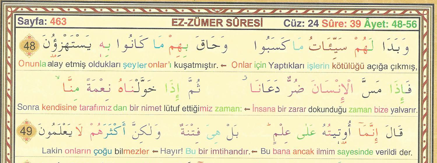 Fe iza messel insane durrun deana, summe iza havvelnahu ni’meten minna kale innema utituhu ala ilm, bel hiye fitnetun ve lakinne ekserehum la ya’lemun.